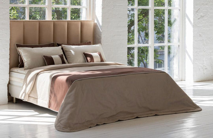 Os seus gomos direitos e fundos dão-lhe um design nobre. A parte de trás está decorada com botões dourados. Tanto as costas como os lados da cama são volumosos. O padrão da cabeceira é composto por unidades separadas, em vez de apenas puxões. A frente da cama repete o padrão volumoso da cabeceira e é ligeiramente saliente.